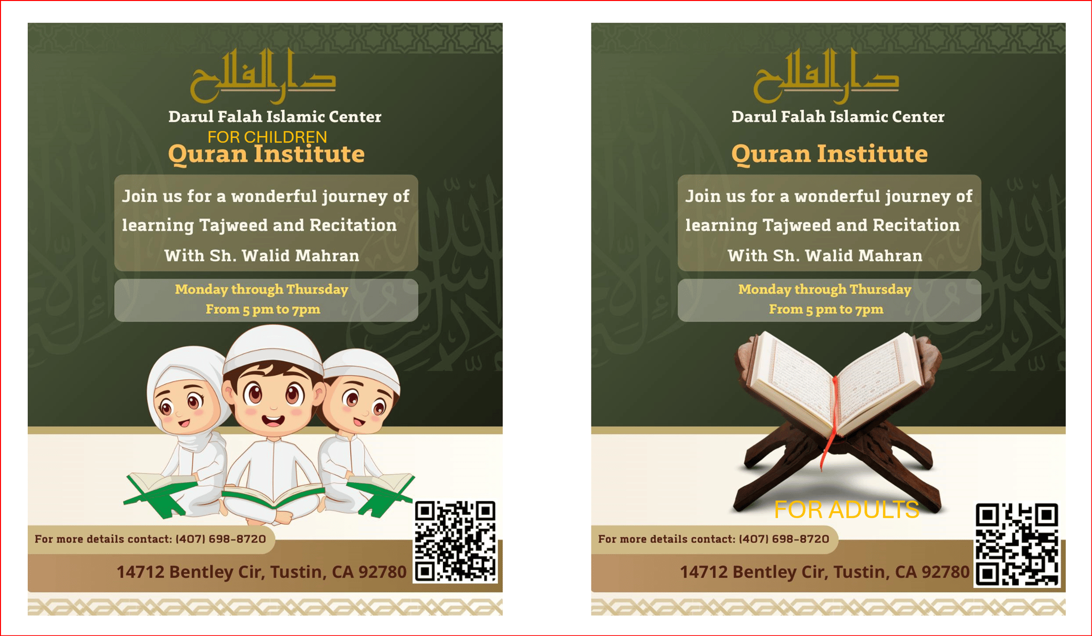 Quran classes led by Sheikh Walid Mahran starting October 20 - Monday through Thursday from Asr till Isha . Sheikh Walid has bee teaching adults and children from many years. Currently teaching at other Masjids including ICOI. He will now be heading the Quran Institute at Darul Falah. There will be 2 sessions Session 1 Mon/Wed and Session 2 Tue/Thu. You can sign up for either one not both.