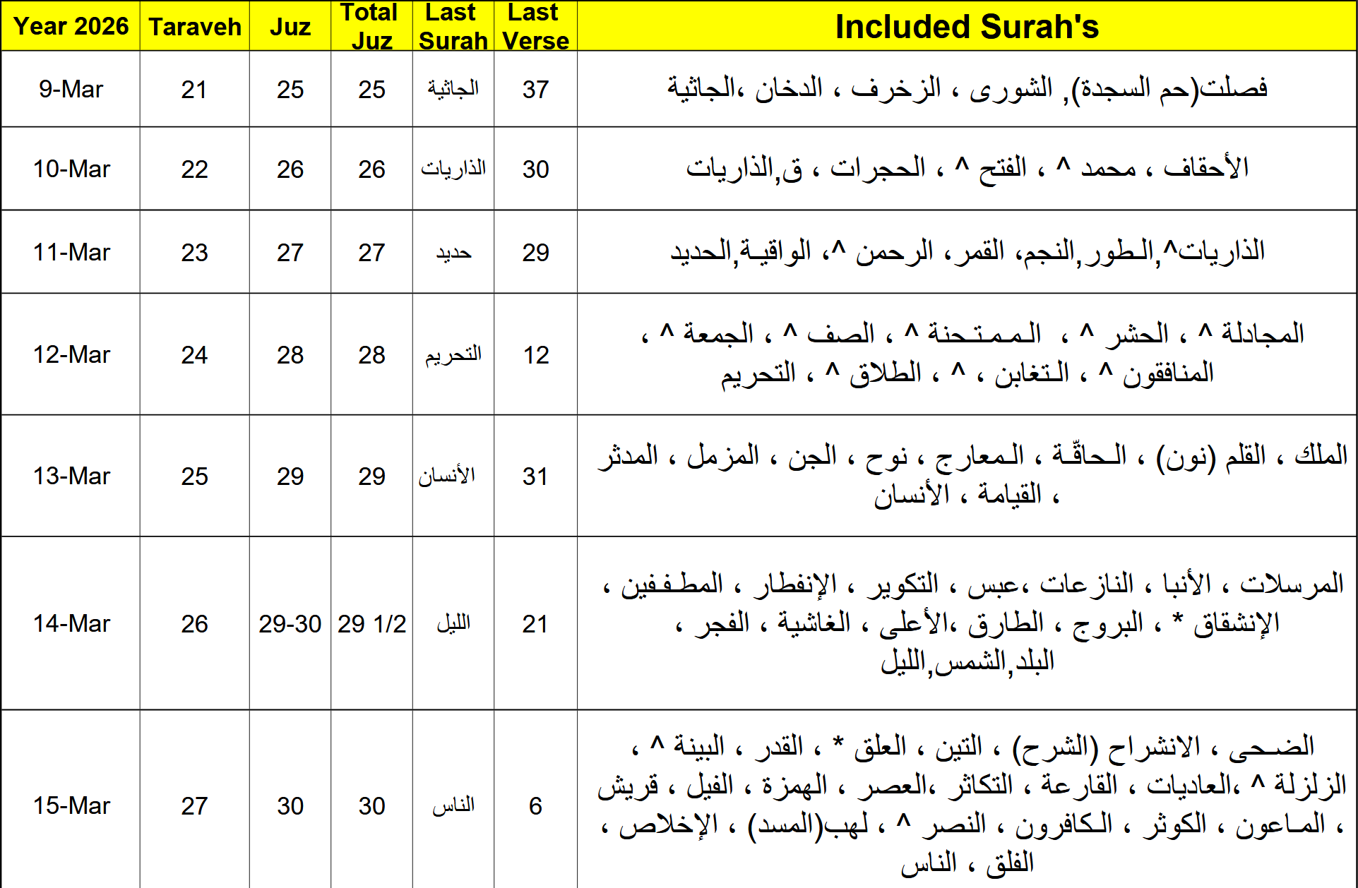 Last 10 Nights: March 9 – March 18 (Isha/Taraweeh at 9:00PM)