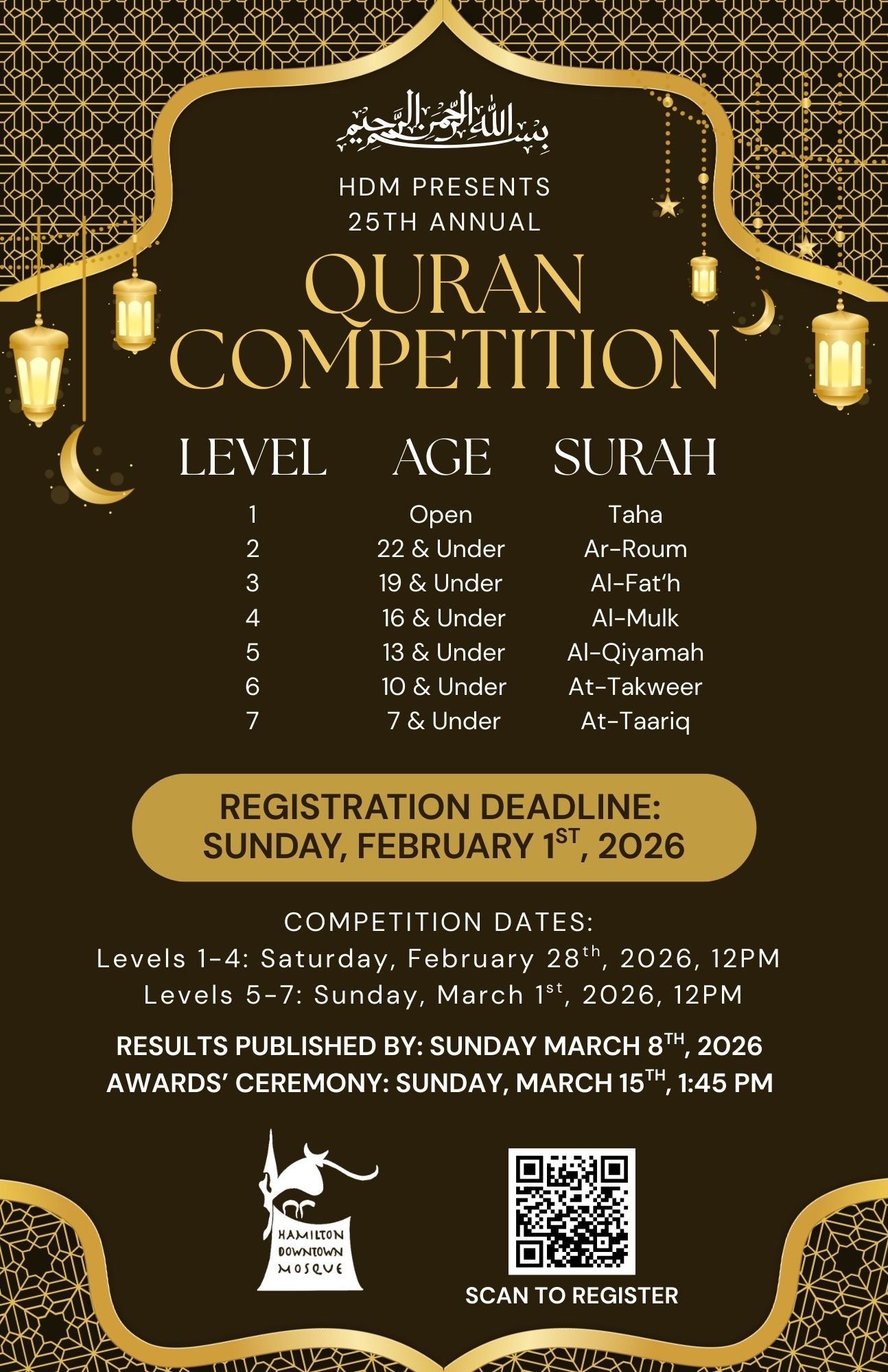 Please be informed that effective Friday, January 9th, 2026, the Iqamah times for prayers at the Hamilton Downtown Mosque will be as follows: