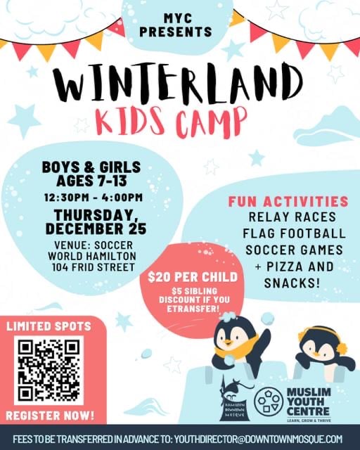 Please be informed that effective Friday, December 26th, 2025, the Iqamah times for prayers at the Hamilton Downtown Mosque will be as follows:
