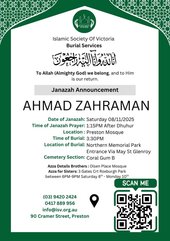 Assalamualaykum 08-11-25 Saturday Janazah Prayer 1:15 After Dhuhur, Burial 3:30PM at Northern Memorial Park Entrance Via May St Glenroy Coral Gum Section
