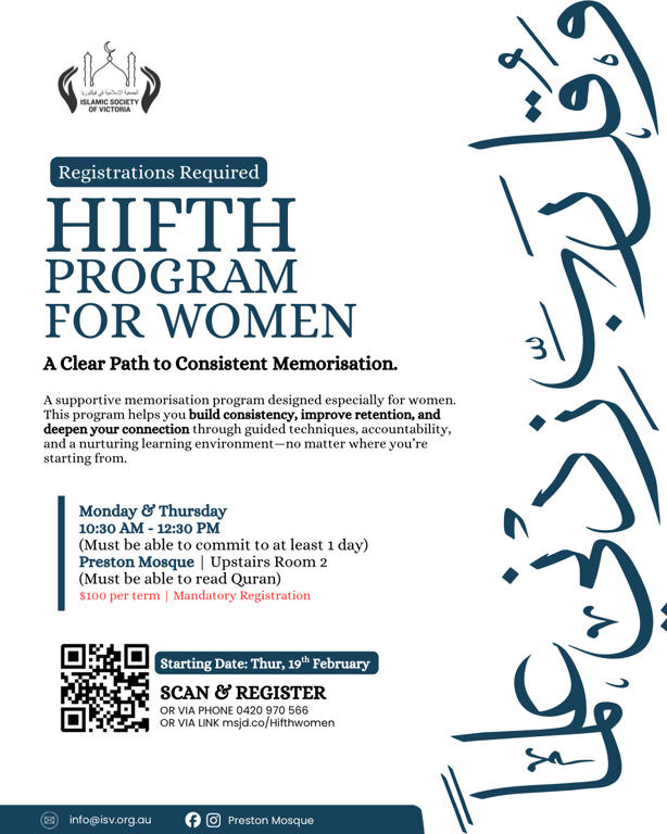 Struggling with consistency or retention? This program offers guided techniques, accountability, and a nurturing learning environment to help you memorise with confidence — no matter where you’re starting from.