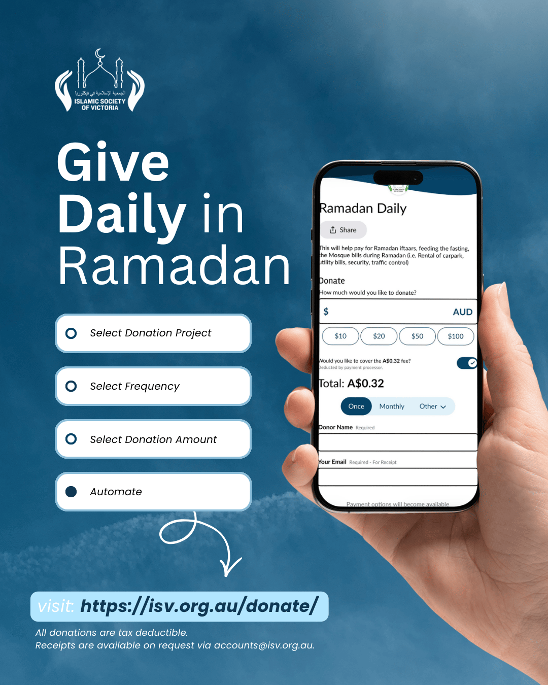 Give daily this Ramadan, reap endless reward 🤲 Donage via the app or link: https://isv.org.au/donate/