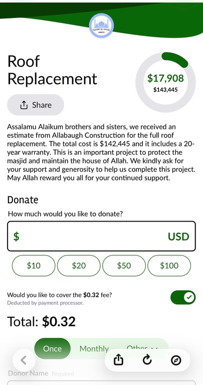 Alhamdulillah, by the grace of Allah (SWT) and your generosity, we have collected $34,950 in checks, $17,908 through the Masjid App, and $500 in cash, bringing our total to $53,358 for the roof repair.