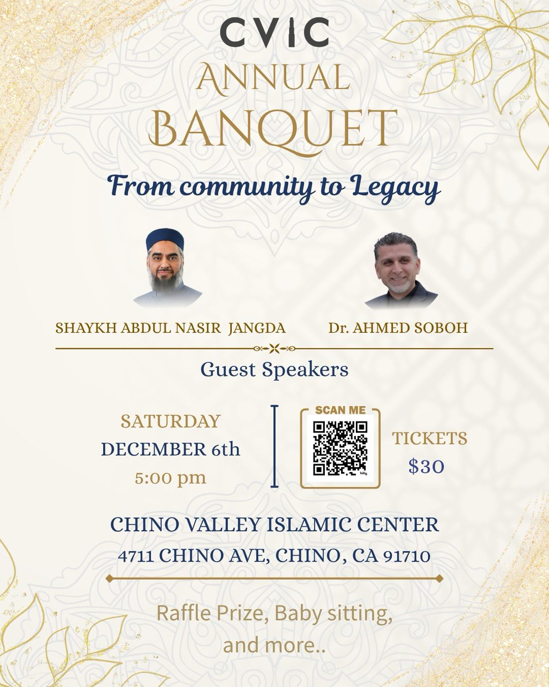 Please join us on December 6th for our annual banquet featuring Shaykh Abdul Nasir Jangda. Purchase your tickets by clicking the following link: https://themasjidapp.org/cvic/events/9141