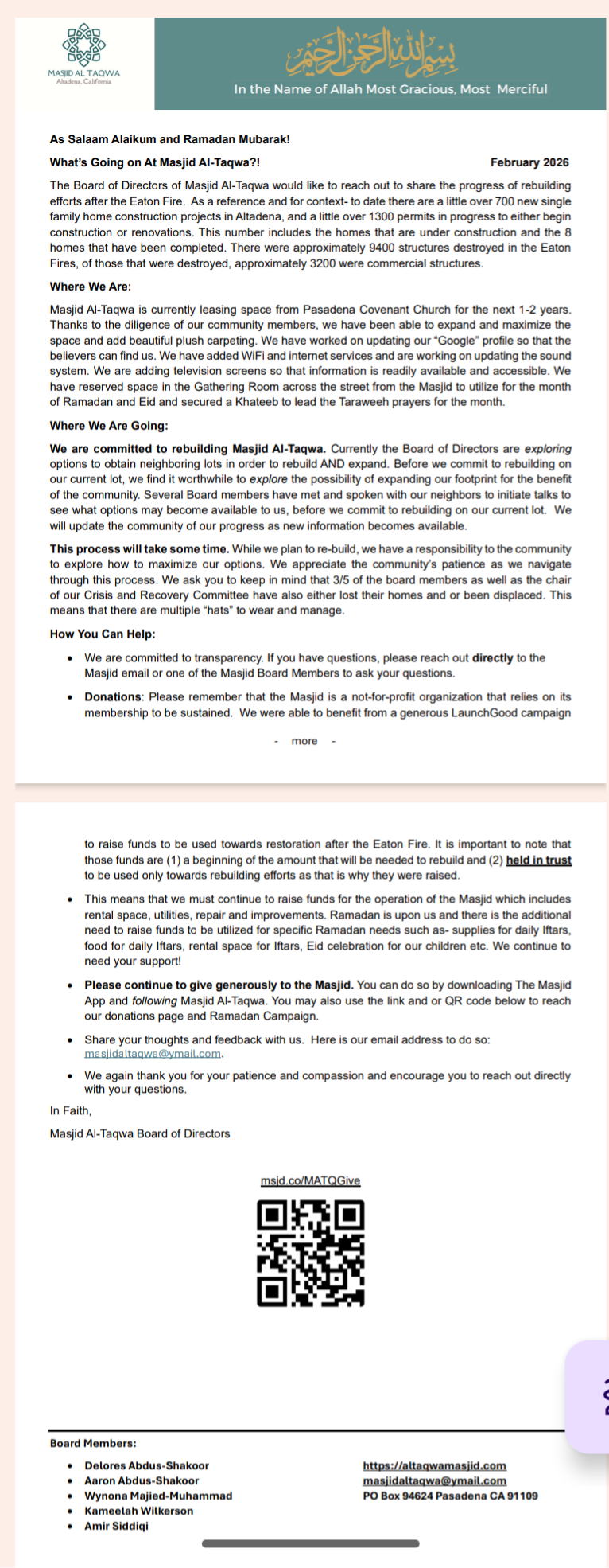 Please follow this link for status updates for Masjid Al-Taqwa. https://drive.google.com/file/d/1fQDPm4g6oklP1ukO8y0_z4PLTFZkIqlj/view?usp=drivesdk