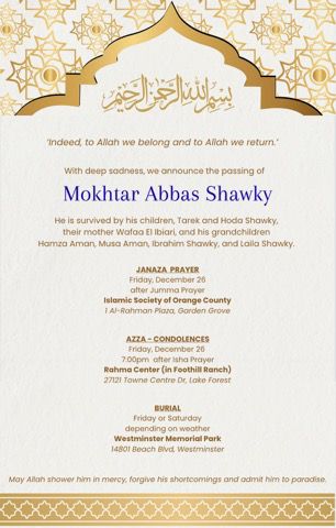 With heavy hearts, we share the news of the passing of our beloved Mokhtar Abbas Shawky. He was a devoted father, grandfather, and family man who touched the lives of everyone around him with his kindness, wisdom, and unwavering faith.