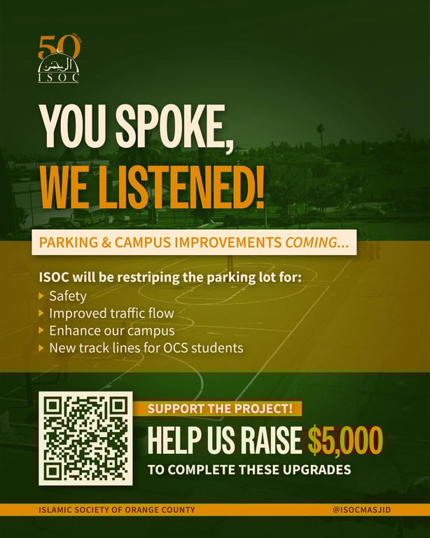 Alhamdulillah, weโre moving forward with re-striping the parking lot at ISOC to help ease Jumuโah parking and improve overall traffic flow, safety, and campus organizationโincluding new track lines for OCS students.