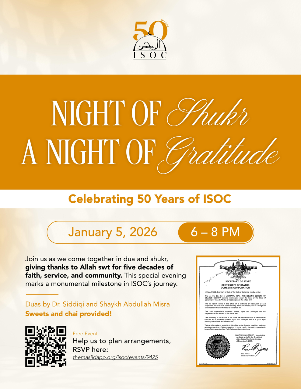 Tomorrow Night, Night of Shukr, Night of Gratitude: Celebrating 50 Years of ISOC! ๐