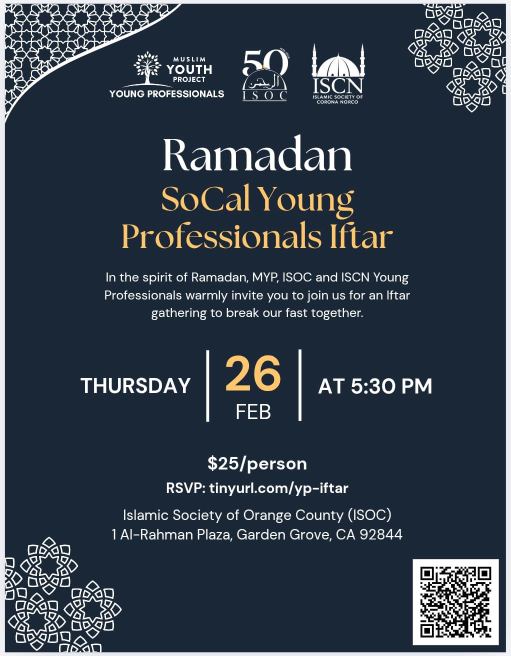 Today is the last day to register for the YOUNG PROFESSIONALS IFTAR at ISOC taking place this Thursday