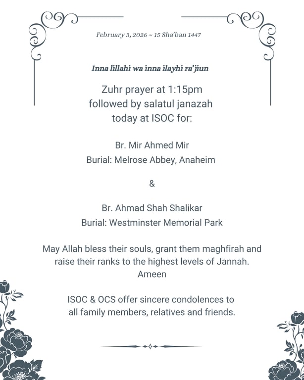 Please send your dua requests to: srashid@isocmasjid.org