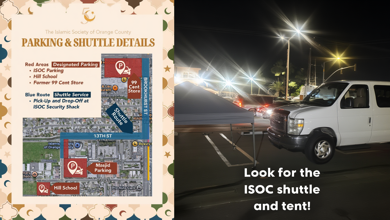 The main parking lot is now full and closed off. Please head directly to the former 99 Cent Store parking lot and use our shuttle service, which will take you to and from the masjid throughout the night.