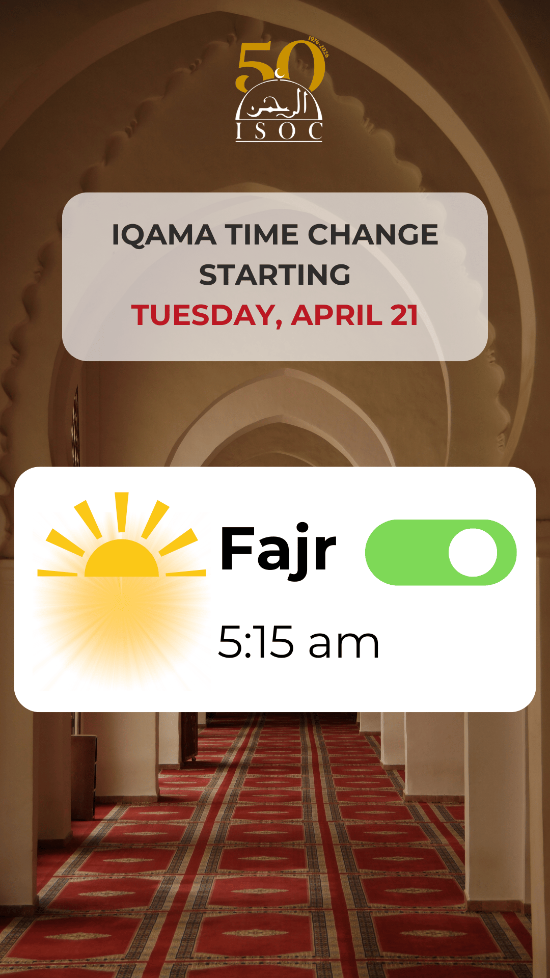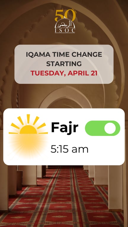 Iqama Time Change!Starting Tuesday, April 21:Fajr @ 5:15 AM