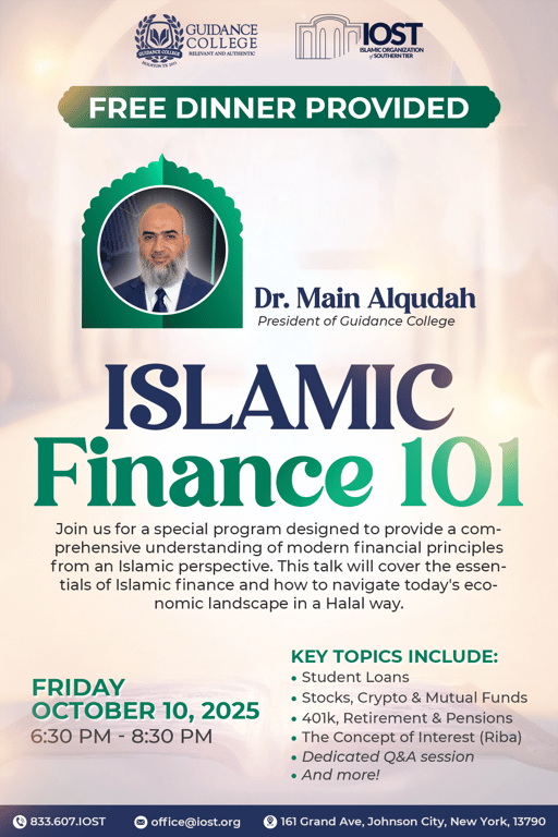 Join us this Friday, October 10th, for a transformative evening at IOST Masjid as we explore the essentials of Islamic Finance with world-renowned scholar Shaykh Main Al-Qudah, President of Guidance College. 🌙