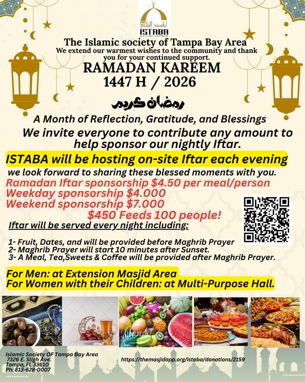 ISTABA will be hosting on-site Iftar each evening.We invite everyone to contribute any amount to help sponsor our nightly Iftar.