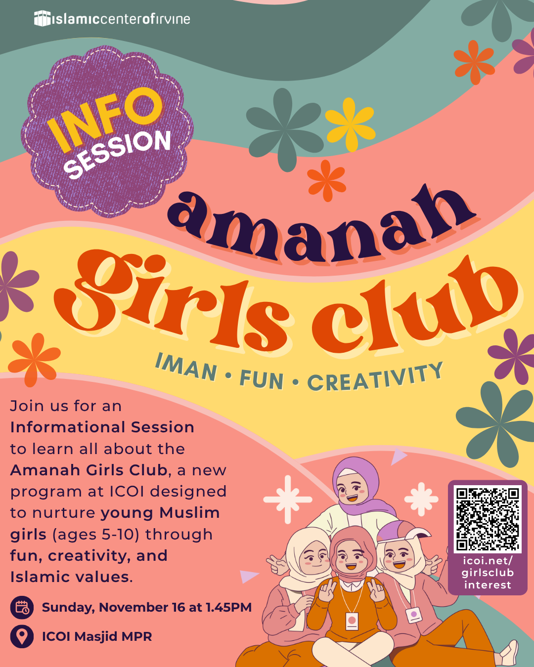 Join us for an Informational Session to learn all about the Amanah Girls Club, a new program at ICOI designed to nurture young Muslim girls (ages 5-10) through fun, creativity, and Islamic values.