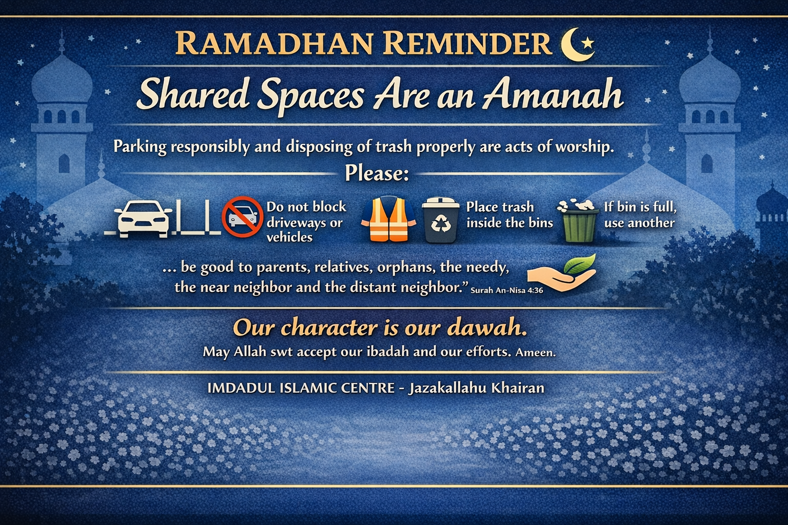 As we enter the blessed month of Ramadhan, our masjid will be fuller, our parking lot busier, and our presence in the neighborhood more visible. Every clean space is silent dawah.