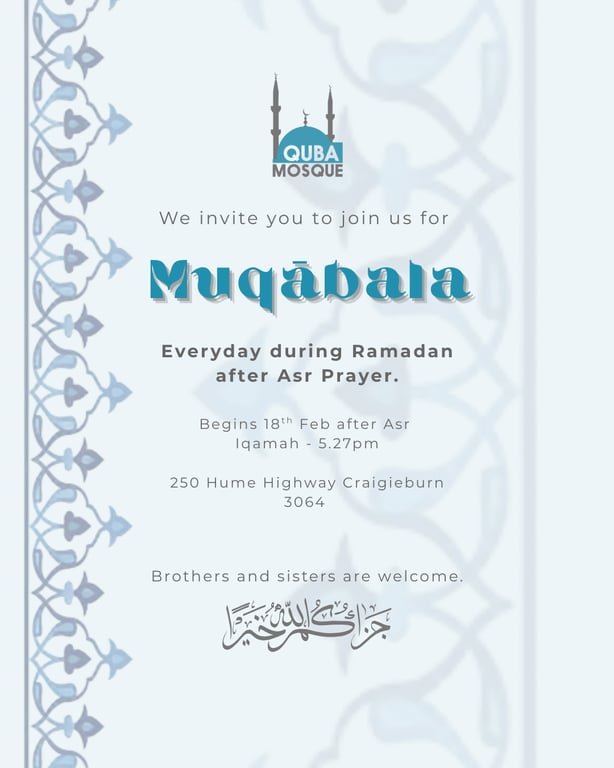 Muqābala at Quba Mosque will commence this Ramadan on 18 February, following the Asr prayer. The Muqābala will continue daily throughout Ramadan, with one Juz recited each day.