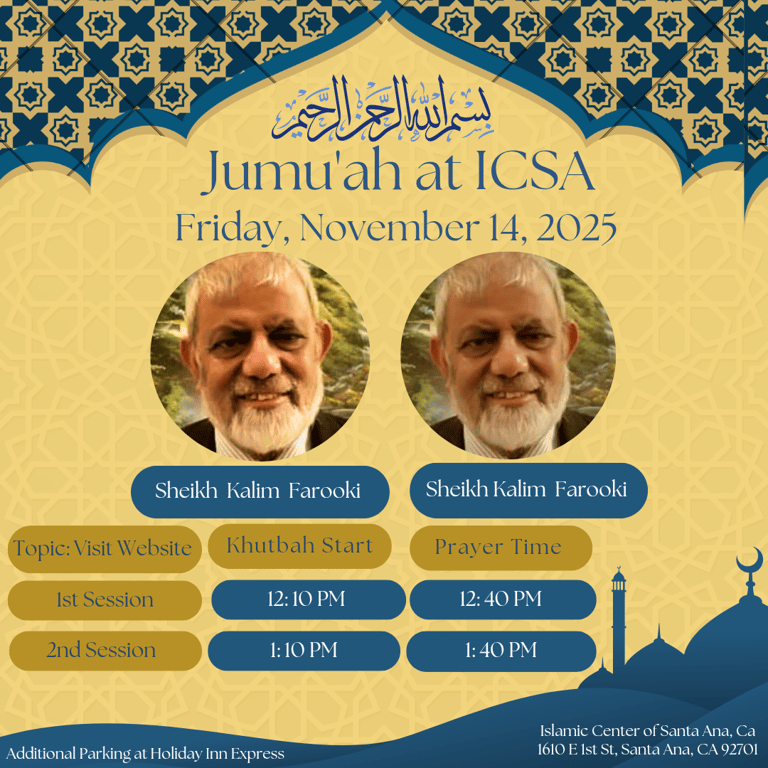 Al-Jumu'ah Prayer is held every Friday at the Islamic Center of Santa Ana (ICSA). We hosted two Jumu'ah Salaah Sessions: