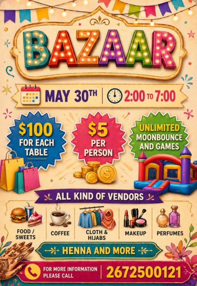 خطبة الجمعة: 1:00 مساءً باللغة العربية و 2:00 مساءً باللغة الإنجليزية.