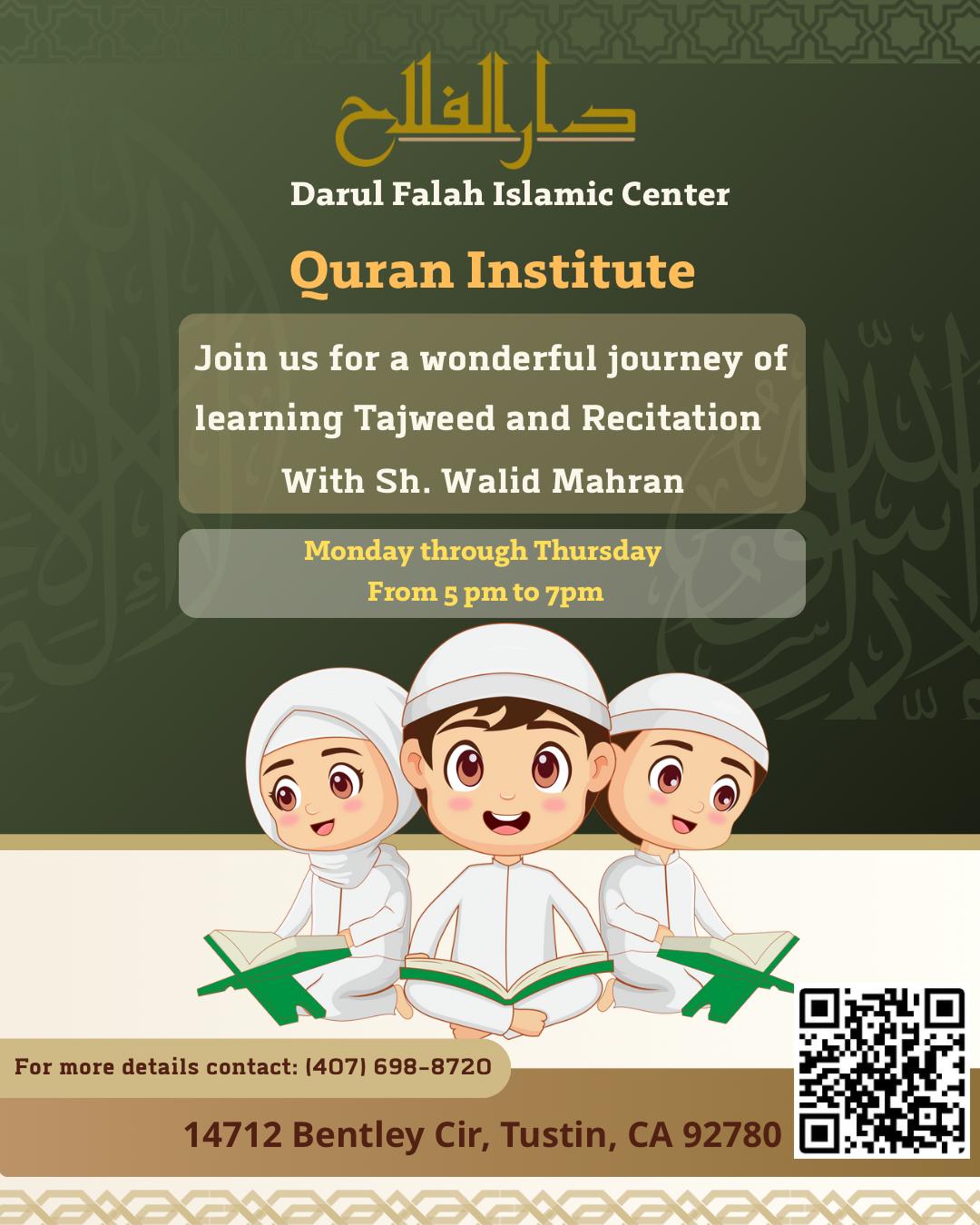 Quran classes led by Sheikh Walid Mahran starting October 20 - Monday through Thursday from Asr till Isha . Sheikh Walid has bee teaching adults and children from many years. Currently teaching at other Masjids including ICOI. He will now be heading the Quran Institute at Darul Falah. There will be 2 sessions Session 1 Mon/Wed and Session 2 Tue/Thu. You can sign up for either one not both. Classes forming now. Please sign up and pay your fees. For financial assistance or mulitiple student discount reach out to the office.