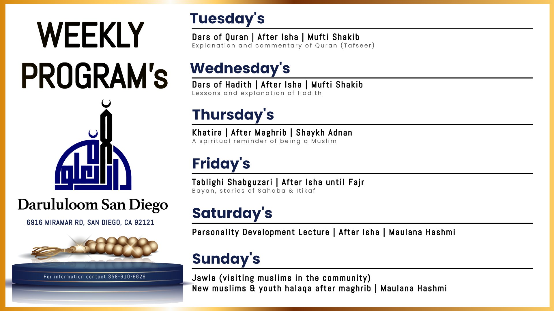 LogoDonateFollowedDonateDonationsEventsDarululoom San Di...Resurface Parking Area Behind MasjidMasjid Donations & SadaqaSupport Masjid Operations$14,875Raised$14,875Goal$1,930Raised$3,000GoalWe heard the feedback on the parking area behind the Masjid. Please help cover the cost.DonateMonthly Donor ProgramBecome a monthly donor and support pay our fixed monthly expenses of $3000.After School MaktabWeekly Monday to Thursday 3:30 PM to 6:00 PM starting Septemeber 27thMasjid PremisesFee: $125.00Quran, Religious Studies and Tutoring. Only $125 permonth per child. Register now for limited spots.Enroll NowFriday 1:15 PM (Next September 24th)Main Prayer Hall & Parking LotSuggested Donation: $20.00Tap to ShareMonday - Wednesday from5:30 PM to 7:30 PMMain Prayer HallEvening Quran program for boys & girls, ages 5 and above. Nazra means reciting the Holy Quran by looking at theEnroll NowFriday KhutbaNazra-e-Quran408 FollowersYou are following this MasjidTap here to get directionsTap here to get directions14712 Bentley Cir, Tustin, CA, 92780View TimetableEmail UsAthanIqamaDarululoom San Di...Darululoom San Di...Darululoom San Di...FajrFajr5:28 am6:37 am12:46 pm4:13 pmSunriseDhuhrAsrMDhuhrAsrMaghrib6: