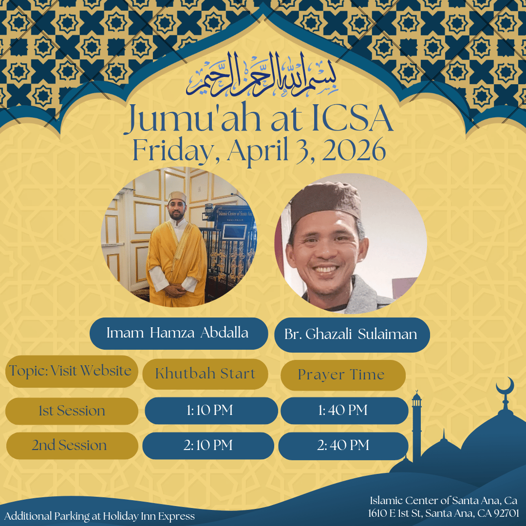 Al-Jumu'ah Prayer is held every Friday at the Islamic Center of Santa Ana (ICSA). We hosted two Jumu'ah Salaah Sessions:
