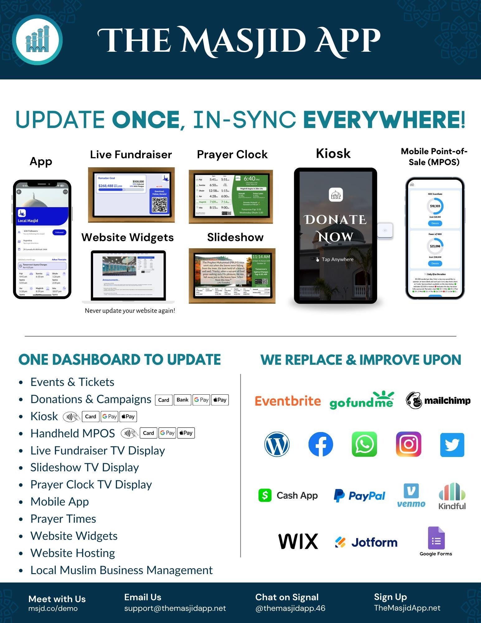 Manage your Masjid on one platform. We offer Prayer Time Management System (wall clock, signage, website, app), Digital Signage, Donation Platform, Website Integration, Mobile App, Kiosk, Donation Platform, Athan and Iqamas, and Events (Live Streaming coming soon). Trusted by 450+ Masjids from 14 different countries. See more information in the flyer below.