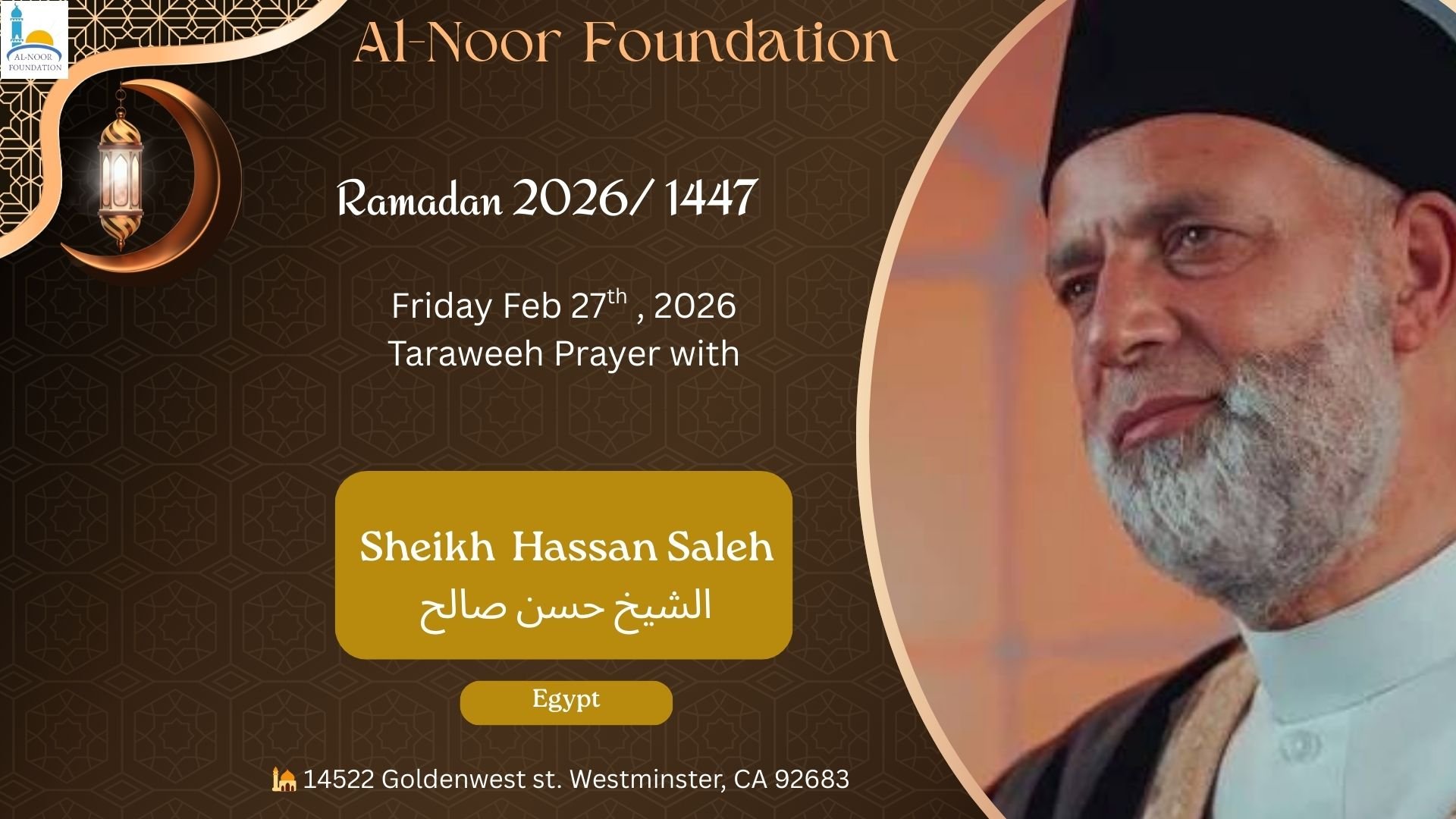 Taraweeh will be led by Sh Hassan Saleh next Friday Feb 27th, inshallah.