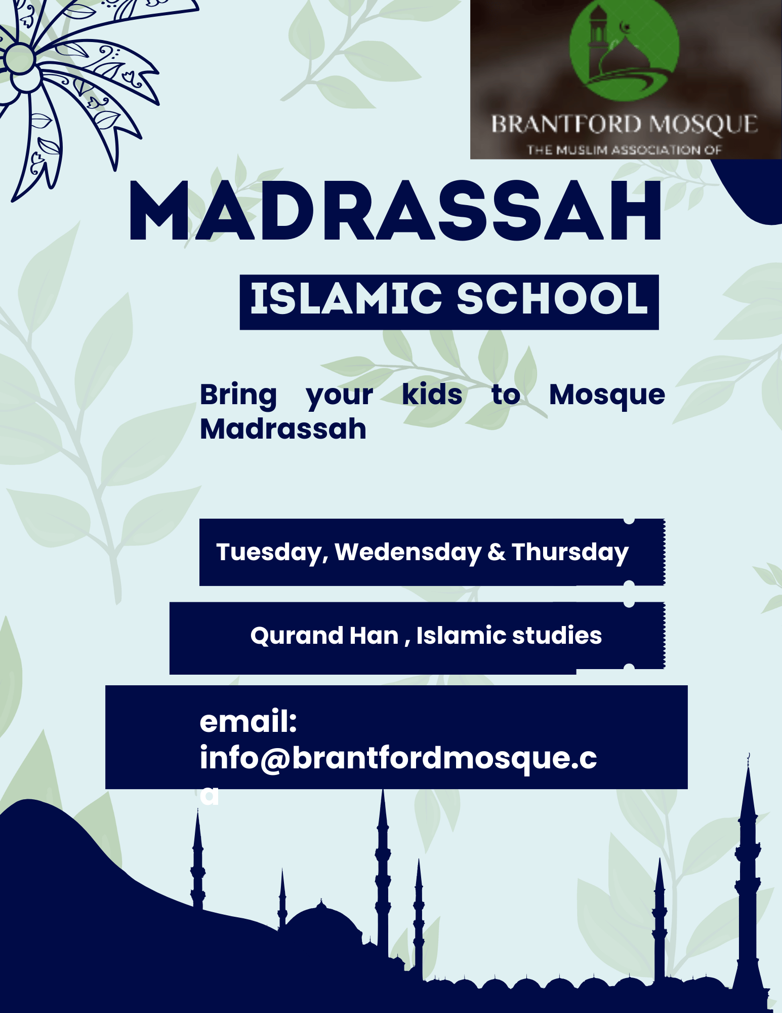 Bring your kids to Masjid to learn Quran and Islamic studies. Monthly fee payable on the app under "MAB Madrassah Fees" 1 child 70 CAD 2 children 120 CAD 3 or more children 150 CAD