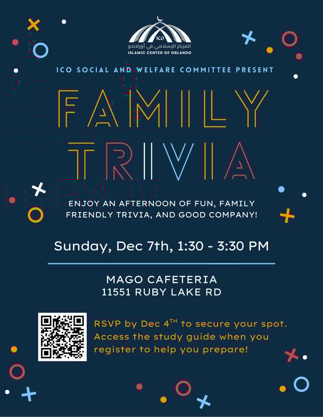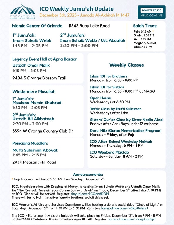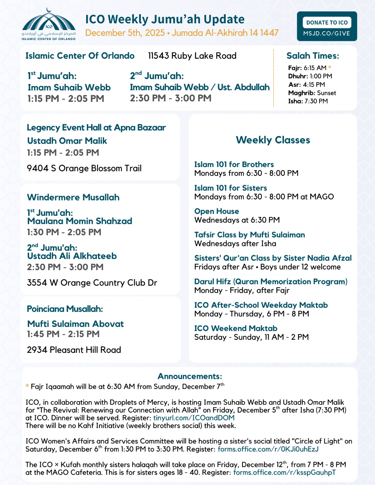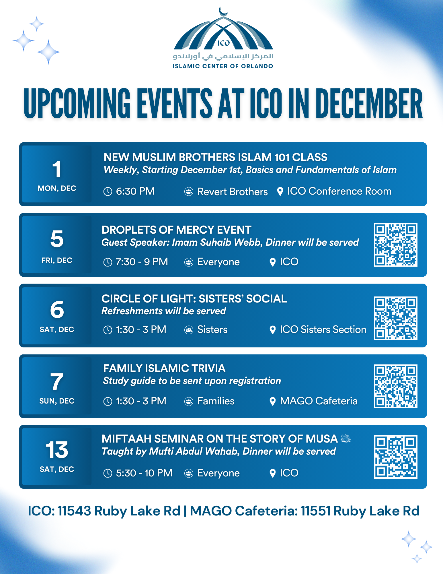 ICO will be hosting a family night titled "The Islamic Perspective on Holidays" with a lecture by Mufti Sulaiman Abovat on Saturday, November 29th, after Isha (7:30 PM) at ICO (11543 Ruby Lake Rd). Refreshments will be served. All community members are encouraged to bring their family and friends. Free registration is required via the link below to help us get an accurate headcount.