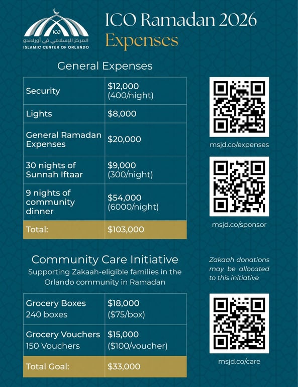 Supporting Zakaah-eligible families in the Orlando community in Ramadan Grocery Boxes: $18,000 (240 boxes - $75/box) Grocery Vouchers: $15,000 (150 Vouchers - $100/voucher) Total Goal: $33,000