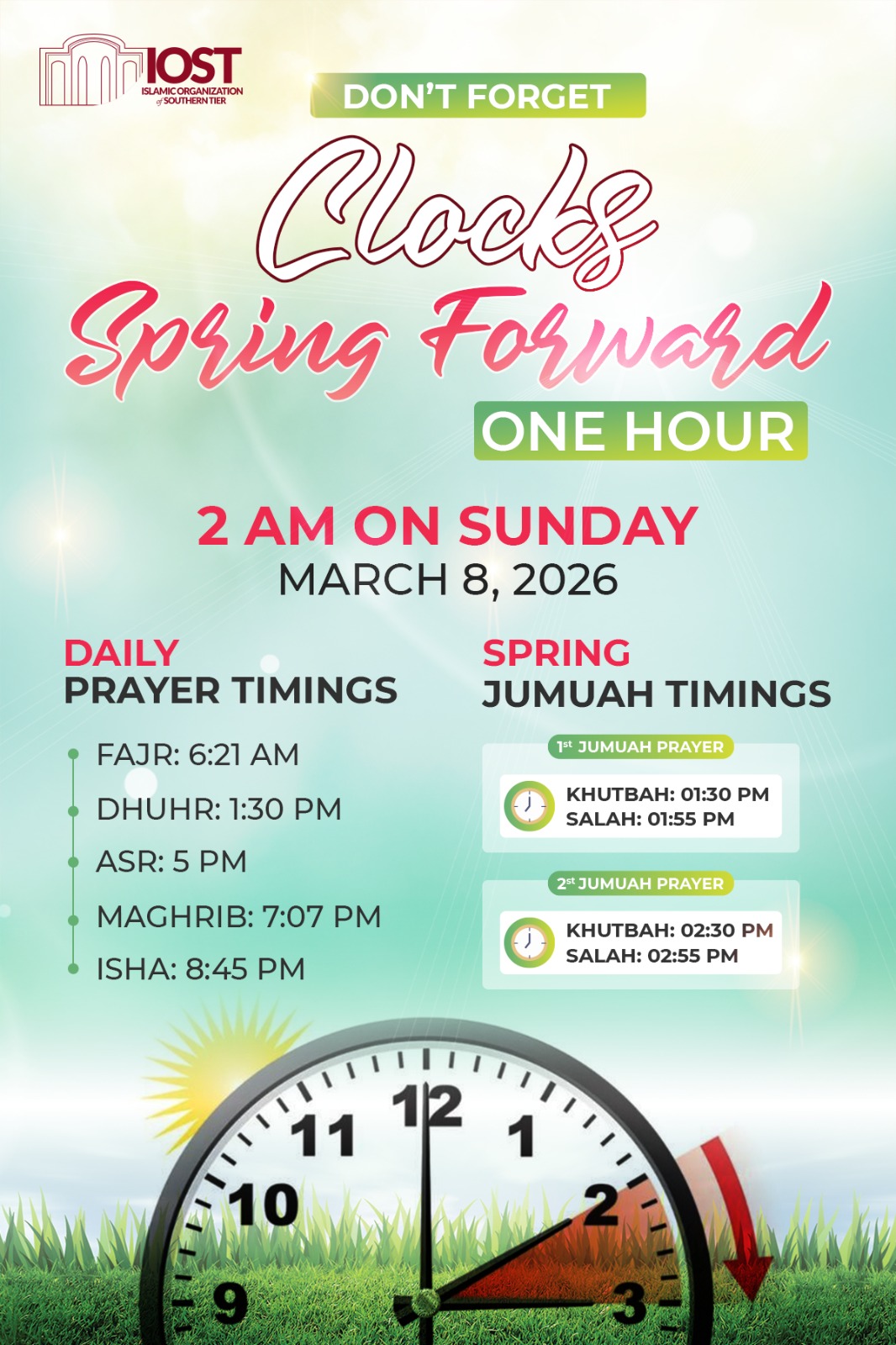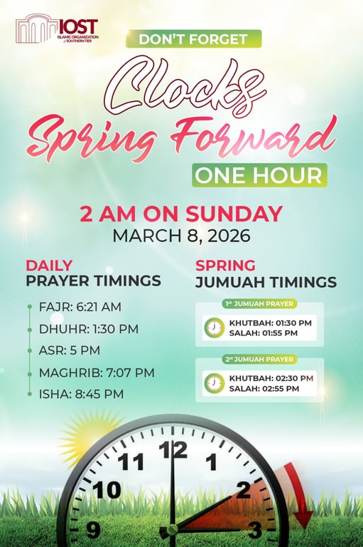 Please be advised that Daylight Saving Time begins at 2:00 AM tonight (Sunday, March 8). As we "Spring Forward," there are two critical changes for our Ramadan routine at IOST: