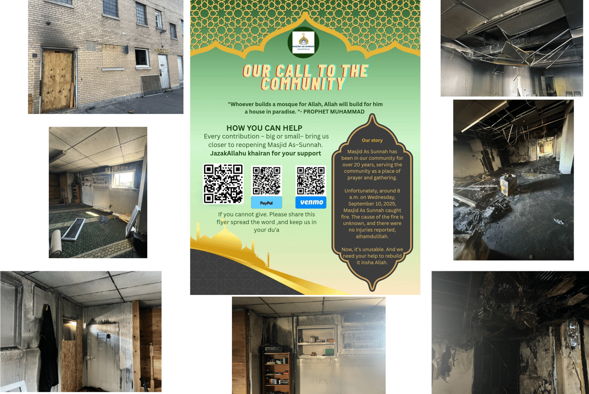 Our beloved Masjid, a cornerstone of our community for 20 years, was devastated by fire on September 10, 2025. The flames may have damaged our building, but they cannot diminish our faith or the spirit of our Ummah. This sacred space where we gathered for five daily prayers, celebrated Eid, held Jummah services, taught our children Quran, and supported one another through life's challenges now needs us more than ever.