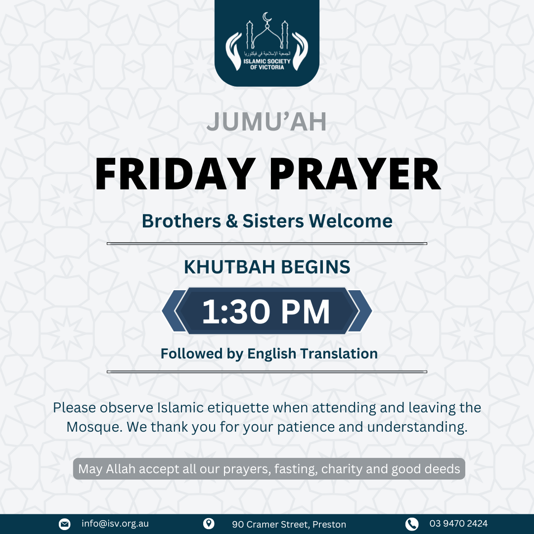 Friday Prayer/Jummah Time Brothers and Sisters Welcome 1:30PM start Please be respectful of our neighbours and observe Islamic etiquette.