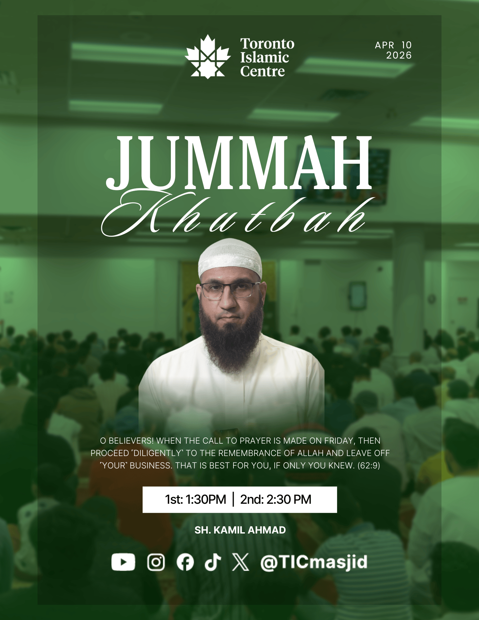 Leave aside work, school, and errands this Friday and answer the Quranic call to hasten to the remembrance of Allah at the Toronto Islamic Centre. Join an inspiring Jummah khutbah with Sheikh Kamil Ahmad and reconnect your heart with Allah together with your community.