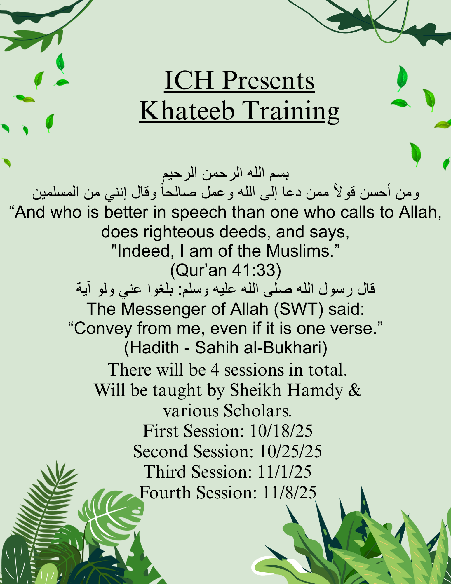 4 Sessions total Taught by Sheikh Hamdy and other scholars Brothers only Once there are a sufficient number of enrollments, dates will be announced inshallah.