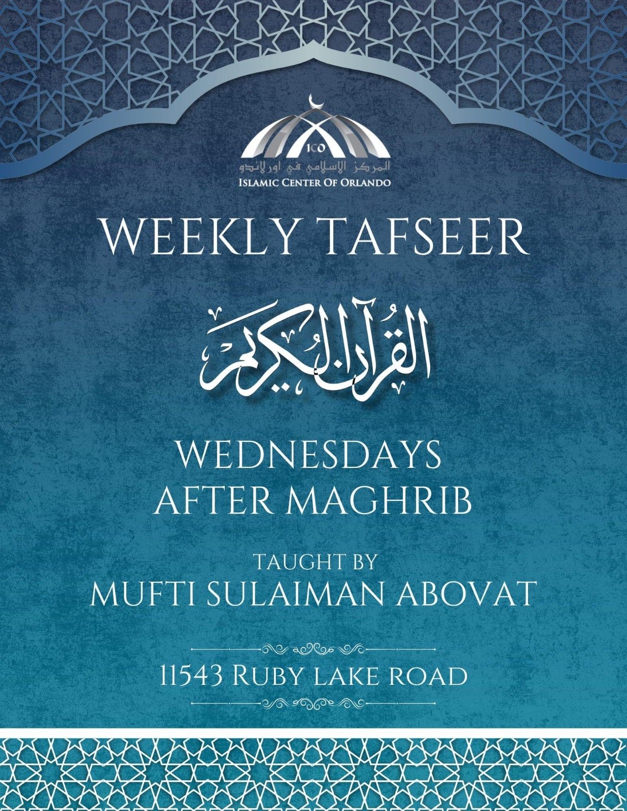 We are pleased to announce that our Weekly Tafseer Class will be restarting tonight (Wednesday, April 1st) where we will be covering Surah 'Abasa. Please note that due to daylight savings time, the class will now take place after Maghrib (7:46 PM) at the Masjid (11543 Ruby Lake Rd).