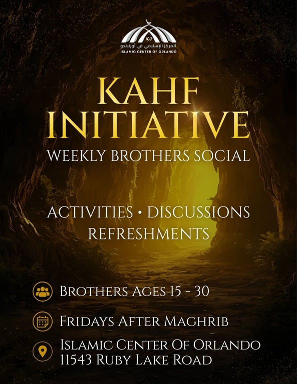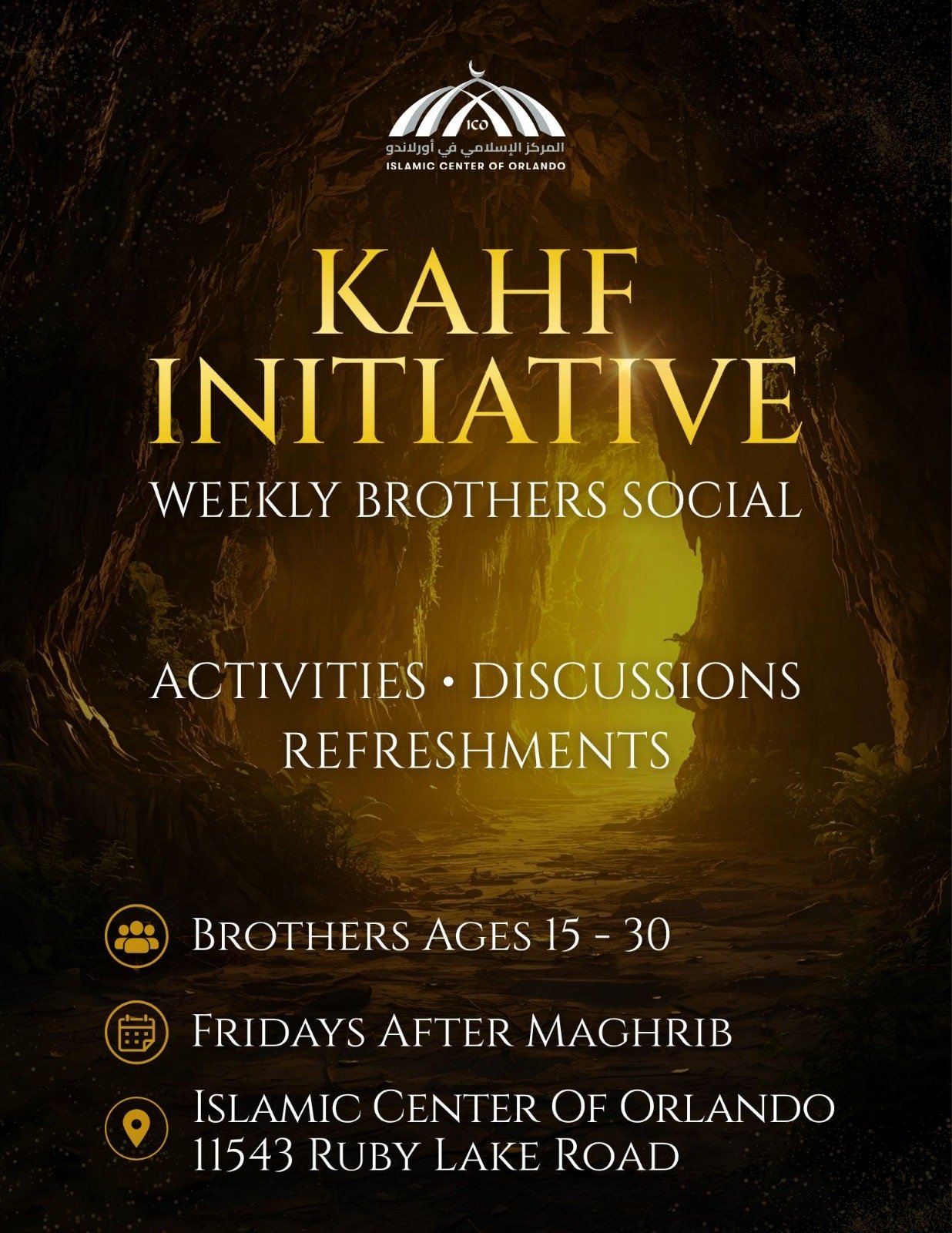 Join us tonight for the Kahf Initiative, a weekly social for young brothers ages 15–30 with discussions, activities, and refreshments every Friday after Maghrib (7:44 PM) at ICO.