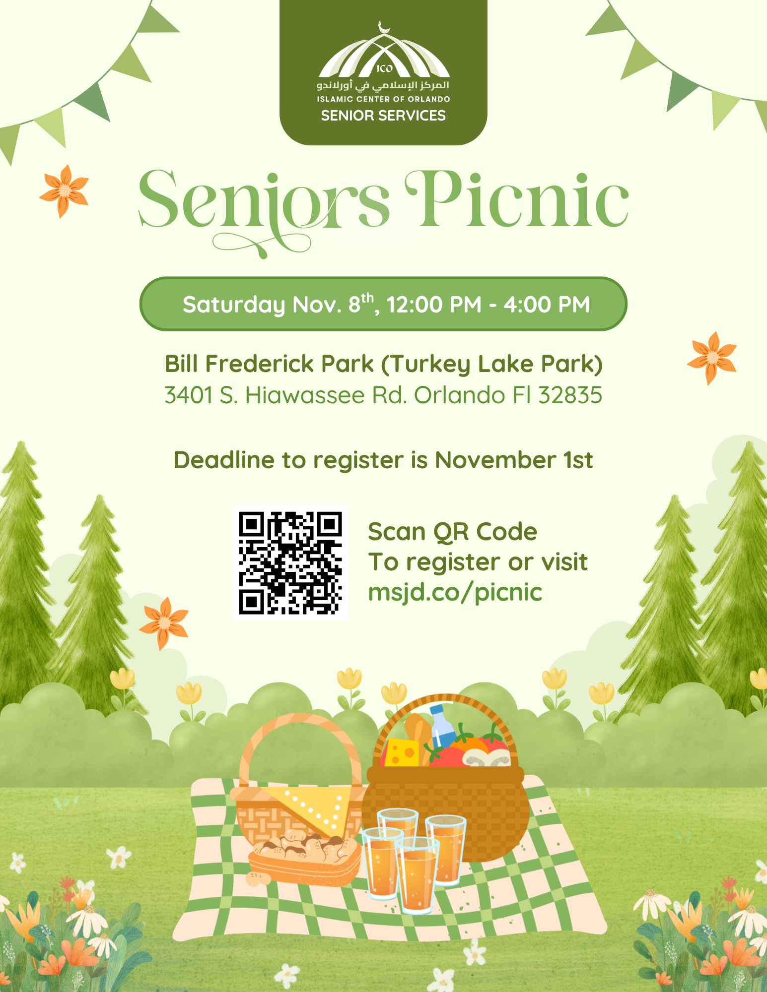 ICO Seniors Services Committee will be hosting a Seniors Picnic for Ages 60+ on Saturday, Nov. 8th, from 12:00 PM - 4:00 PM at Turkey Lake Park. All seniors are invited to attend, socialize, and eat ان شاء الله.