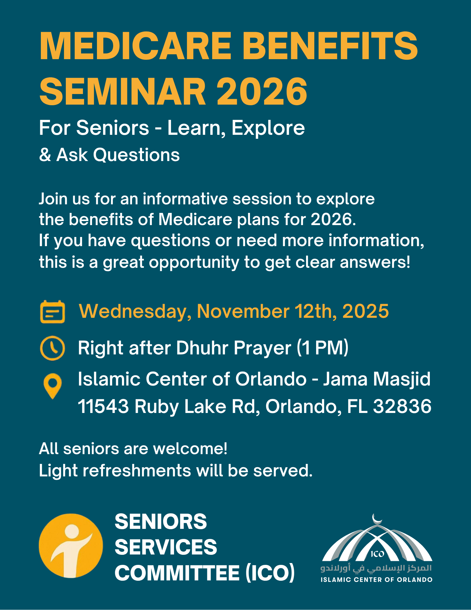ICO Seniors Committee is hosting a seminar on Medicare benefits for 2026 on Wednesday, Nov 12th, right after Zuhr (1 PM) at ICO. All interested Seniors looking to learn more about Medicare are invited to please join InshAllah.