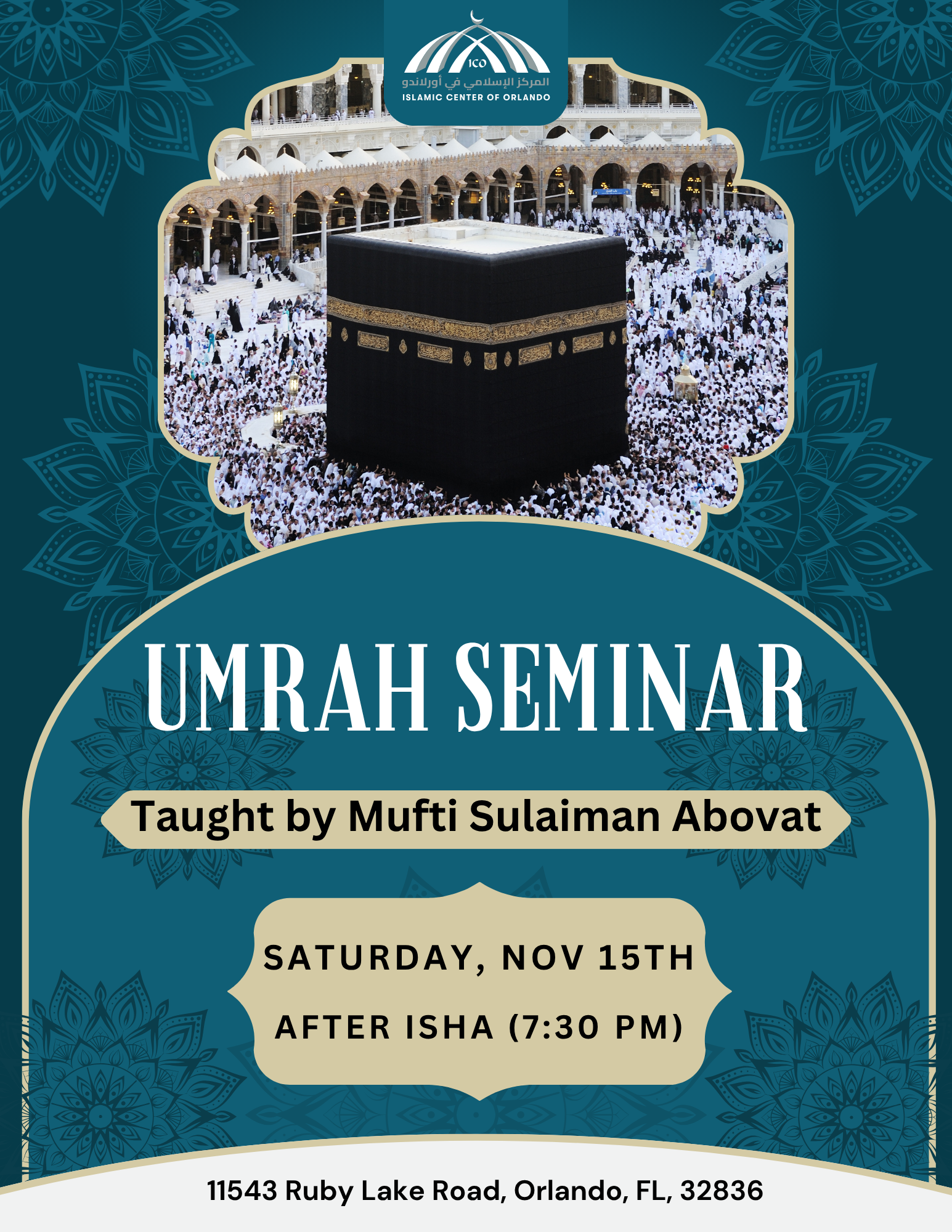 As many families are going for Umrah this winter, ICO will be hosting a Umrah Seminar titled "Umrah Explained: Covering the Method and How to Make the Most" taught by Mufti Sulaiman Abovat on Saturday, November 15th after Isha (7:30 PM) at ICO (11543 Ruby Lake Rd). All community members are invited to attend, especially those going for Umrah.