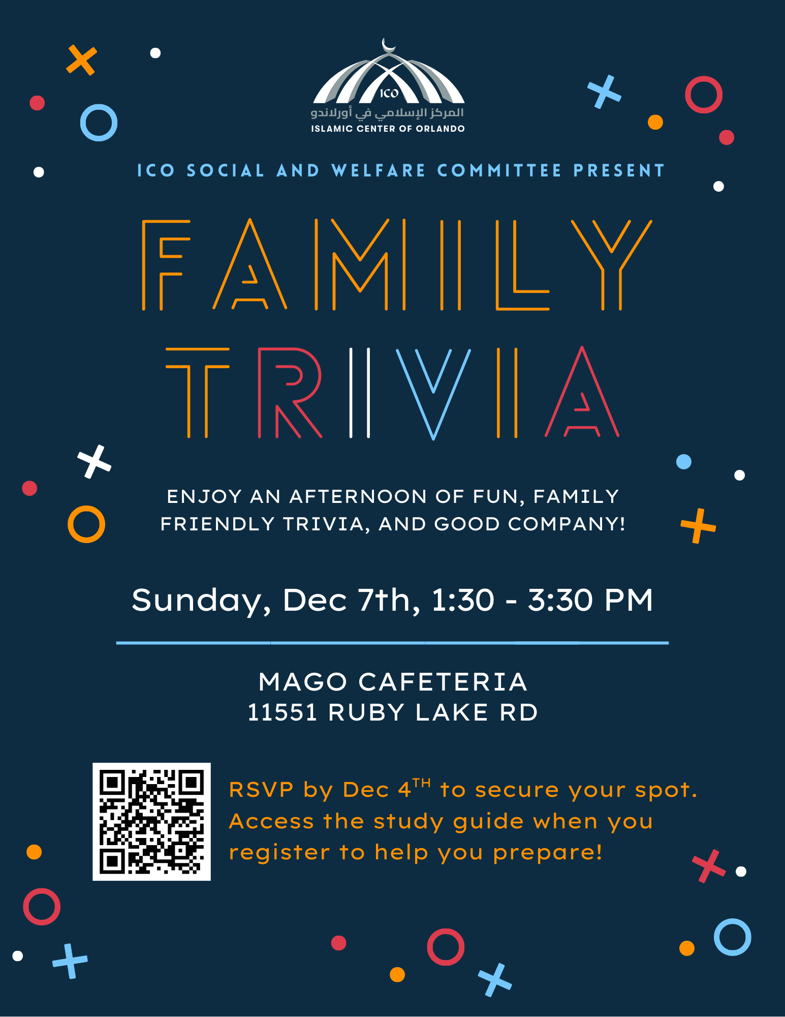 The ICO Social & Welfare Committee will be hosting Family Trivia, an afternoon of Islamic trivia designed for the whole family, on Sunday, December 7th, from 1:30 PM to 3:30 PM at the MAGO Cafeteria (11551 Ruby Lake Rd). All families should register via the link below by December 4th to secure their spots. A study guide will be sent out to everyone who registers to help with preparation. All families are invited to attend, learn, and enjoy, إن شاء الله.