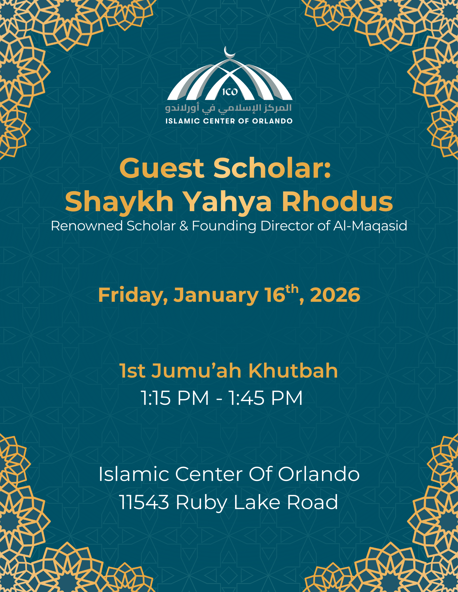 ICO is excited to announce we will be hosting renowned scholar and founding director of Al-Maqasid Seminary, Shaykh Yahya Rhodus, for the 1st Jumu'ah Khutbah on January 16th.