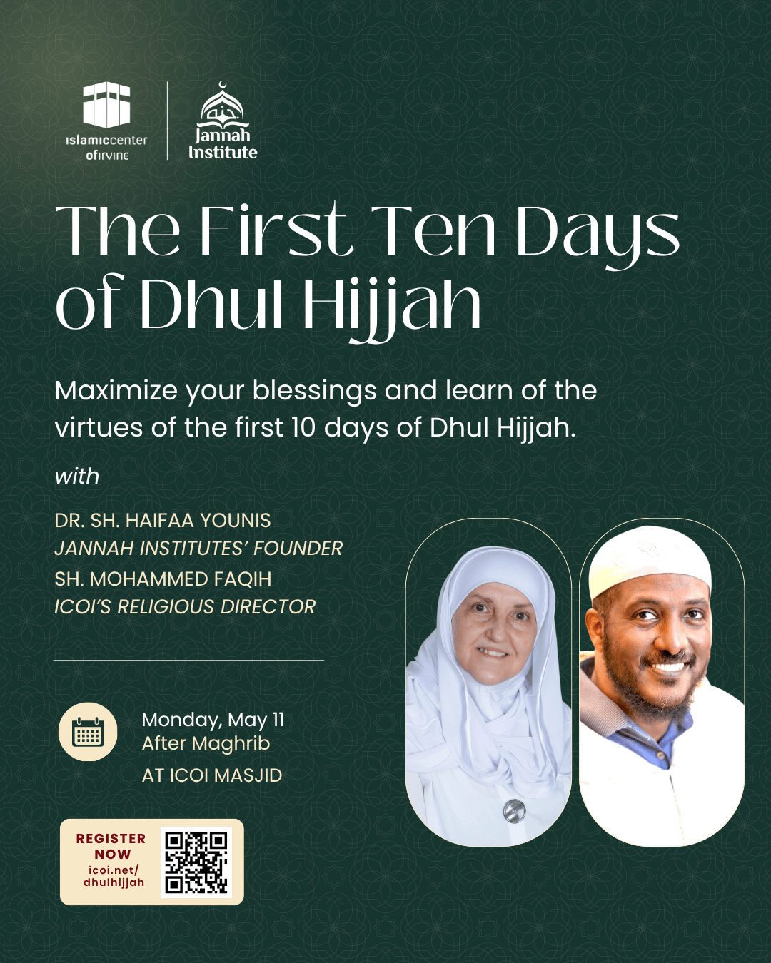Join Dr. Sh. Haifaa Younis & Sh. Mohammad Faqih, for an inspiring evening exploring the virtues of the first ten days of Dhul Hijjah. Discover practical ways to make the most of these blessed days and deepen your connection with Allah.