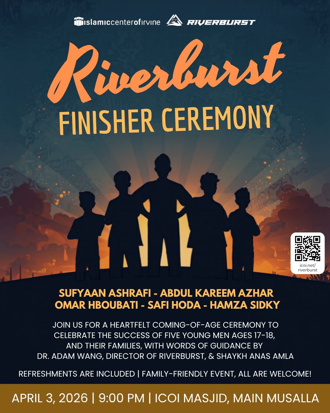 Riverburst invites the ICOI community to join us after Ishaa’ on Friday, April 3rd, 2026, at 9:00 PM at the Islamic Center of Irvine.