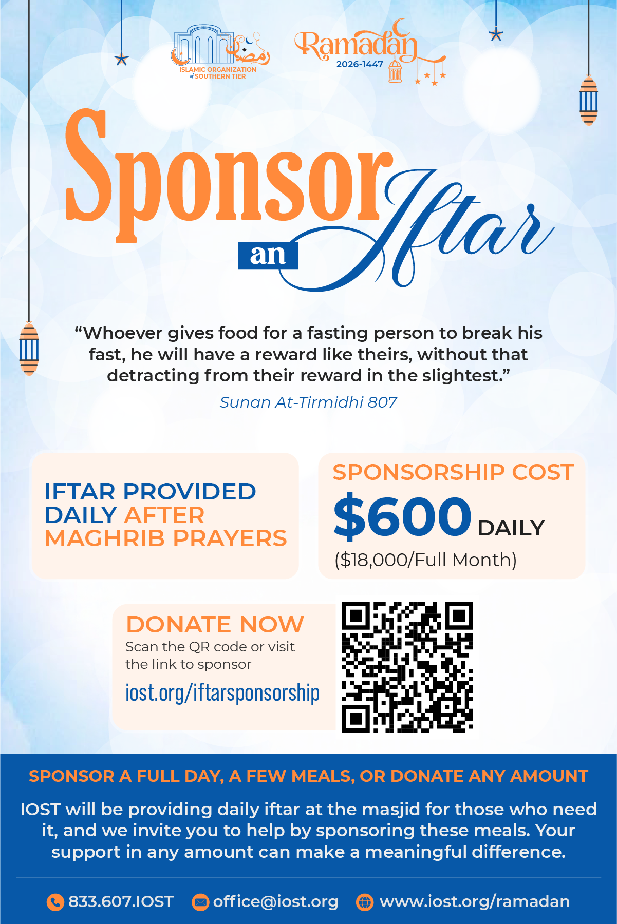 IOST aims to raise $18,000 (or $600 per day) to provide daily iftars at the masjid during Ramadan. Your generous contributions can help us achieve this goal. The Prophet Muhammad (peace be upon him) said, “Whoever feeds a fasting person will earn the same reward as the one fasting.”