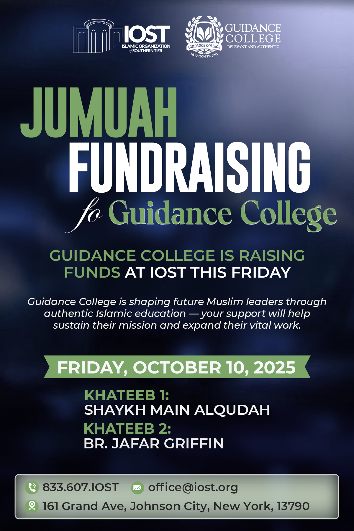 This Friday, October 10th, 2025, the Islamic Organization of the Southern Tier (IOST) will host a special Jumuah Fundraiser to support one of our communityβs vital institutions β Guidance College.