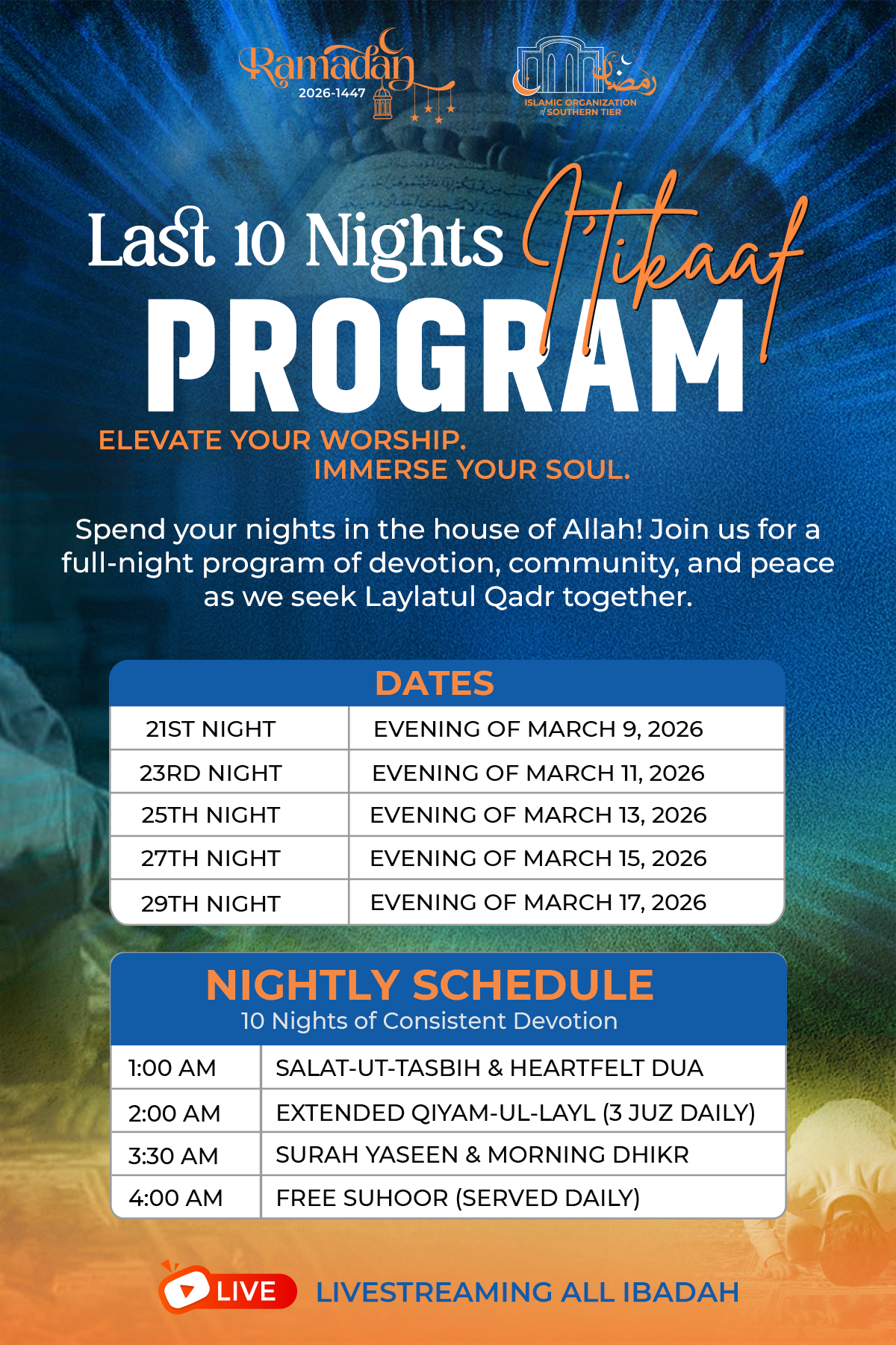 Join the Islamic Organization of Southern Tier for a full-night program of devotion, community, and peace as we seek Laylatul Qadr together. Whether you are joining us for the full ten nights or just one, we welcome every member of our community to immerse their soul in this blessed season.