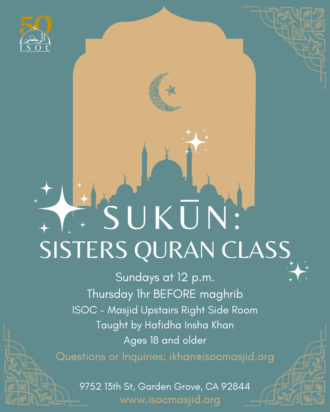 🕚 If you would like to join her class please arrive at ISOC at 12pm sharp on Sunday or 1hr BEFORE maghrib on Thursday.